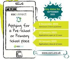 The citizen portal, on the Education Authority Webpage, is live from 12 noon on 10th January 2025 to 12 noon on 24th January 2025 so as online applications can be made. Remember to list your choice of pre schools in order of preference and state how you meet the admissions criteria for each choice.