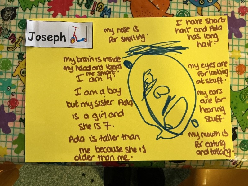 We are learning to chat about ourselves, our facial features and our body parts. We are drawing comparisons between ourselves and others. We are using adjectives to describe colour, shape and size.