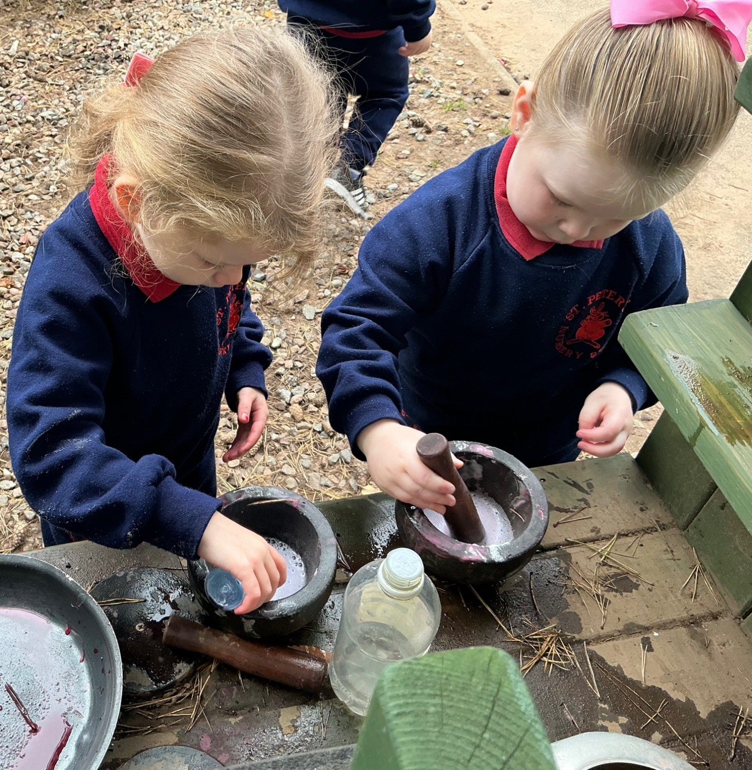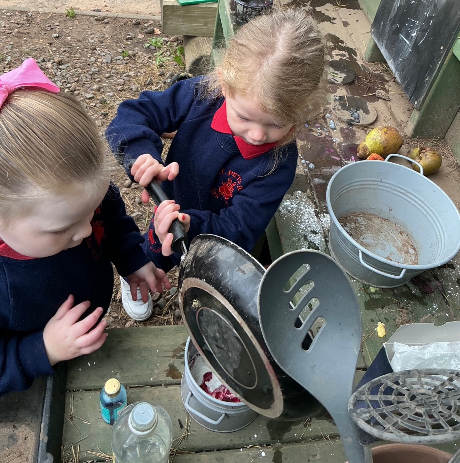 Friday mornings are full of fun here in St Peter’s Nursery School as we experiment with baking soda, vinegar and food colouring in our messy mud kitchen area. Emilee noticed the smell wasn’t so pleasant, Emme & Arlo wanted to cast a spell with their special drinks, Dáire’s special conker pies looked good enough to eat and Ayla was making witch soup for all her friends to enjoy. One of lots of Halloween themed activities for our wonderful children to enjoy.